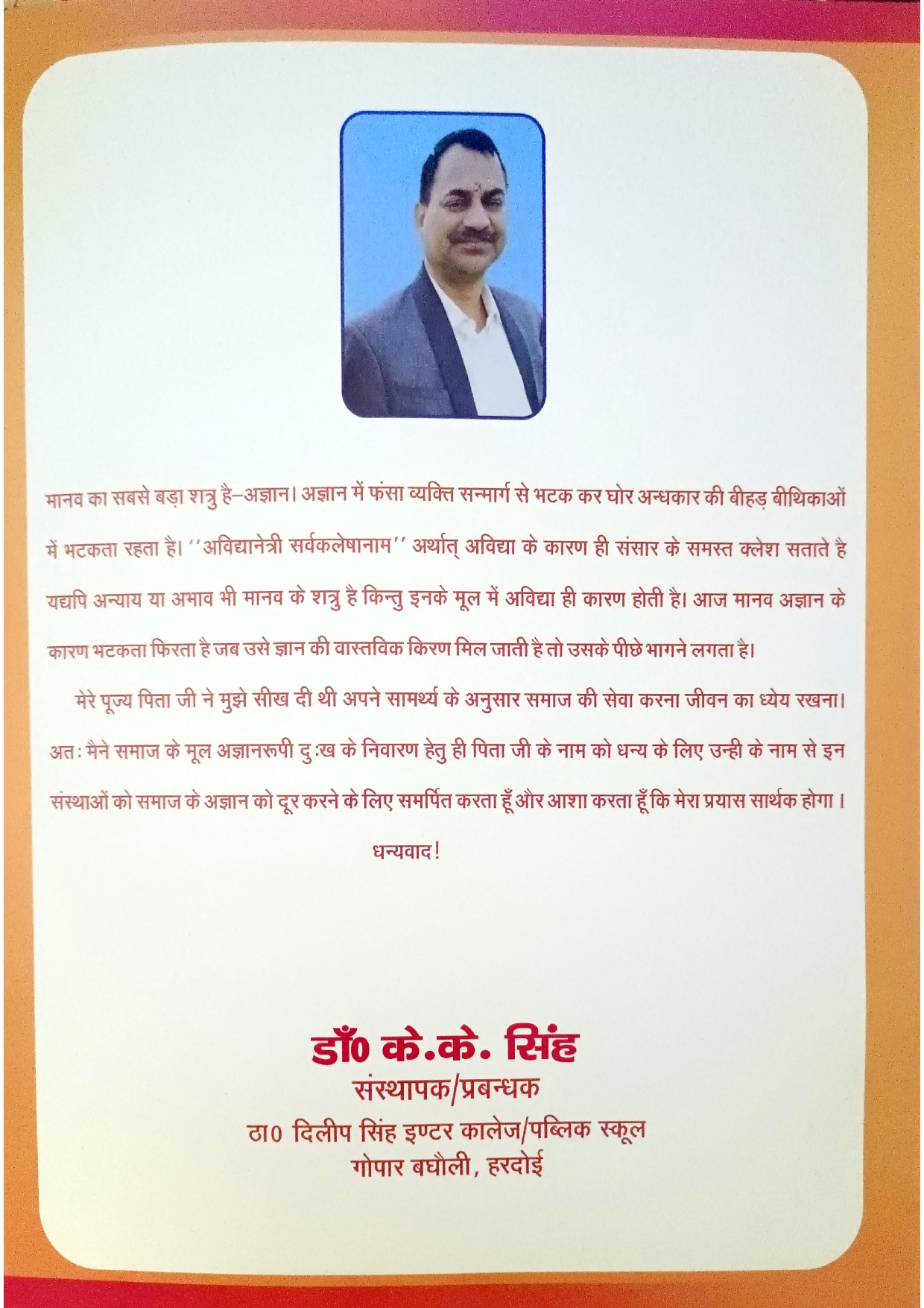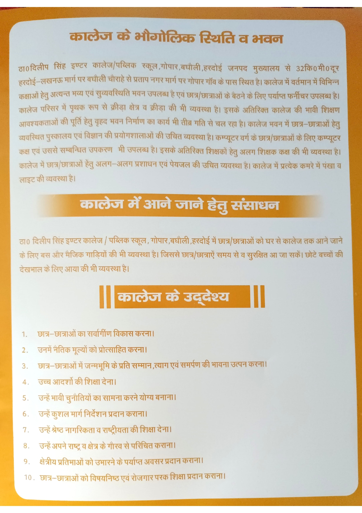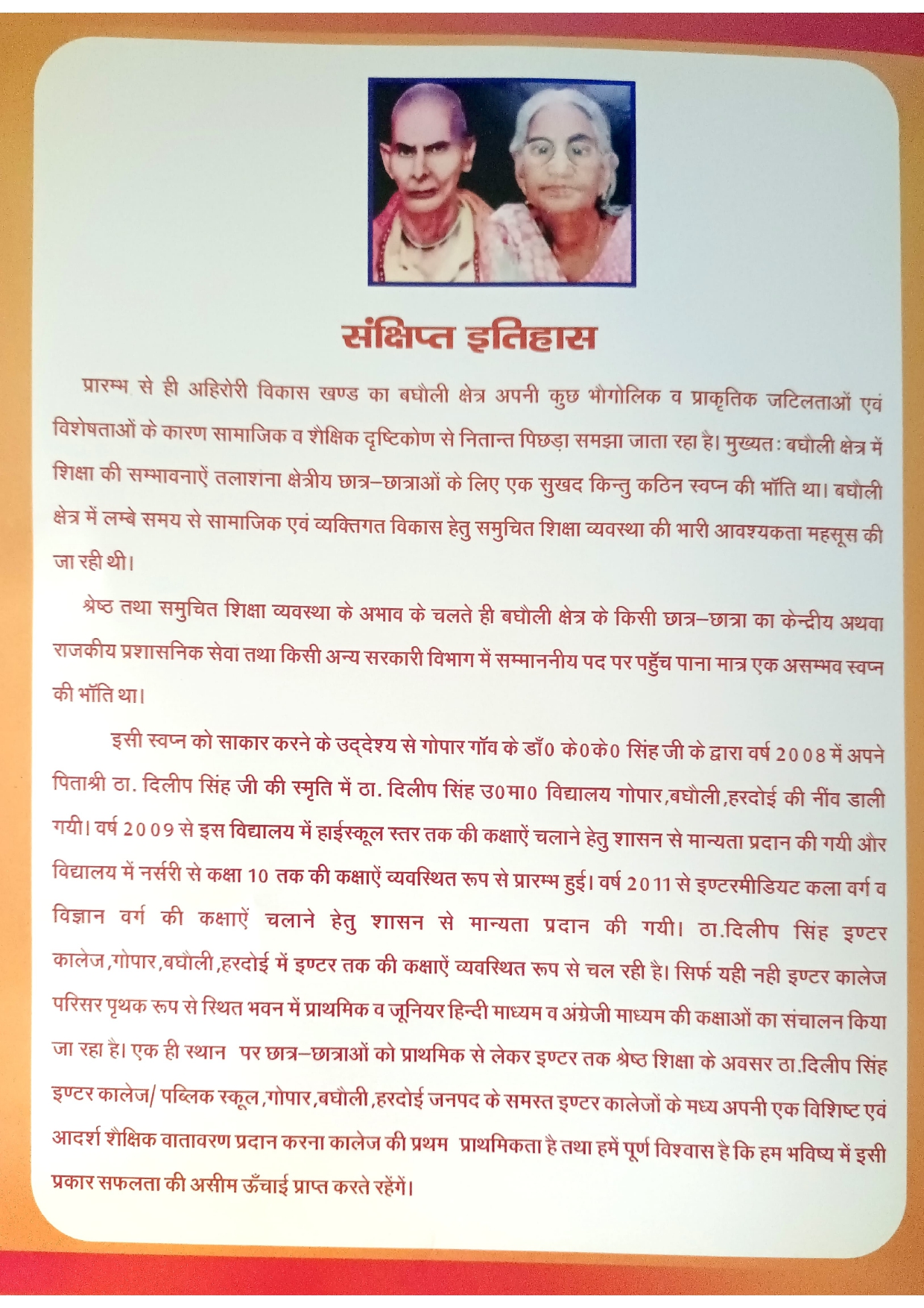 Thakur Dilip Singh Inter College synonymous with quality education, is located in village Hardoi. The school was established in 2008 by Dr. K.K.Singh in the blest memory of his father late Mr. Thakur Dilip Singh. School is affiliated with Board of U.P. where students from Primary to Class Xth achieve some of the best exam result. The school Thakur Dilip Singh Inter College started with a vision to inspire generation of a children to become socially motivated and conscious citizens of India.